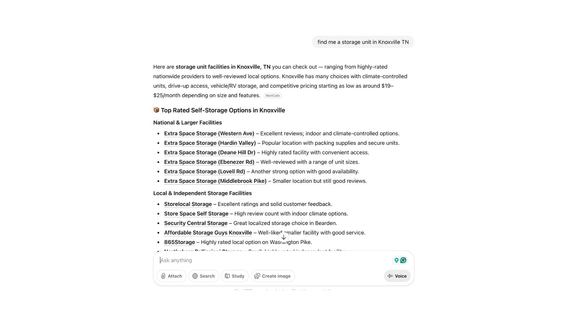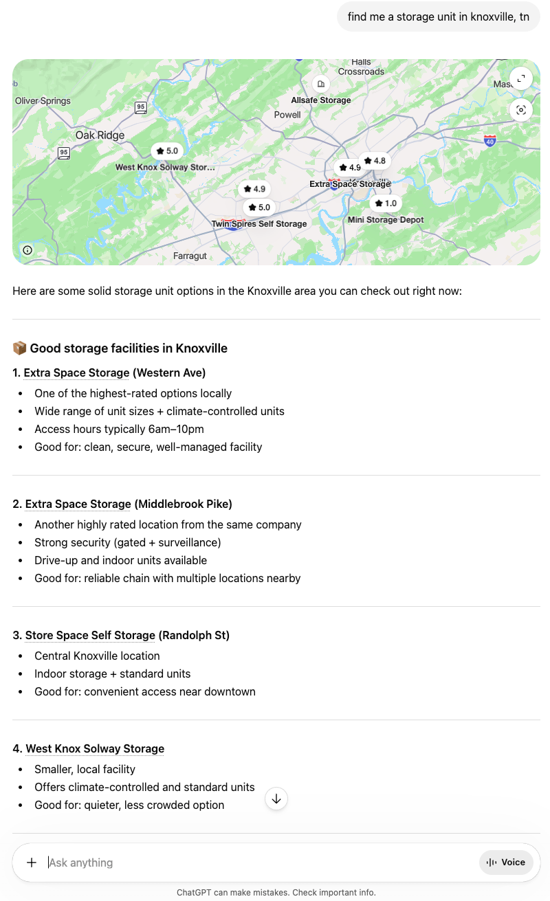 Or, they might ask for the best storage in [your town]. Storage renters don’t often know much about the industry, so they outsource the research to an AI. Your lead doesn’t know how important smart units are vs. climate control vs. security cameras – Claude will give them a breakdown they can understand.