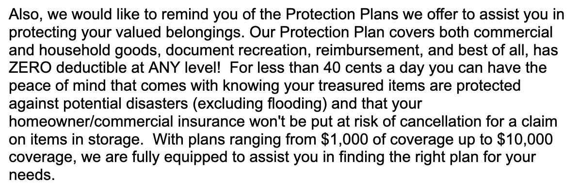 Our Operator Toolkit includes self storage templates to use with only a few customizations. Use the Inclement Weather Protection Plan Email Template as a starting point to inform tenants that you’re entering into bad weather season and letting them know the benefits and costs of your protection plan.